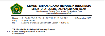 akan menyelenggarakan Training of Trainers (ToT) PD PPKB GPAI Tahun 2022. Berkaitan
